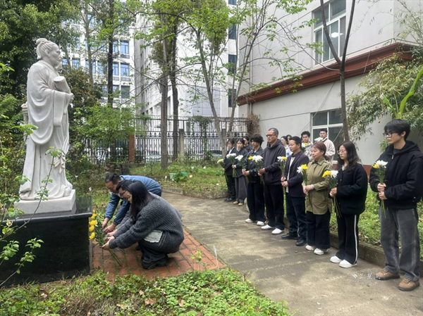4月3日上午,在求索书院屈原塑像前,在“荆楚风流”与“玉兰学府”群体塑像旁,文学院师生代表为屈原、李白、苏东坡、鲁迅等文学巨匠的塑像细细拂拭尘埃,敬献素菊。师生们低首默哀,仿佛穿越时空,与先贤展开一场跨越千年的对话。