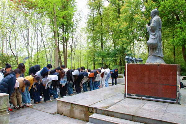 文学院师生代表在楚风园的荆楚风流—-历史名人汉白玉雕像区向炎帝、楚先王、楚庄王、老子、屈原、王昭君、诸葛亮、孟浩然、陆羽、毕昇、李时珍、张居正、张之洞等先贤拜祭并献花。 通讯员周晚霞 摄