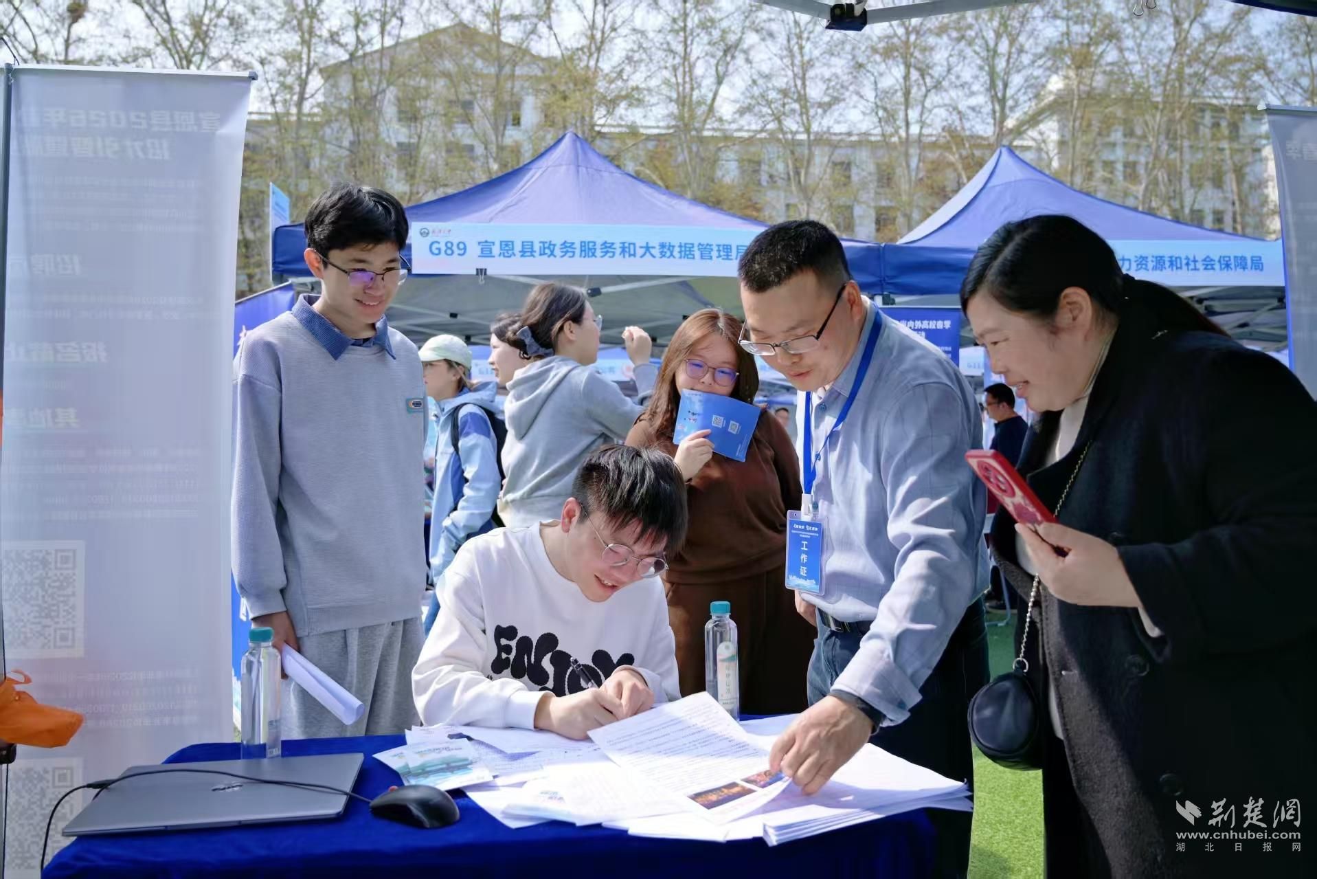 荆楚网(湖北日报网)讯(通讯员袁昌鄂、熊超丹)3月23日至31日,在春意盎然、落英缤纷的武汉,宣恩与武汉各高校学子实现了一场盛大的“双向奔赴”。宣恩县委组织部、县人社局与部分事业单位及县内重点企业,奔赴武汉大学、华中科技大学等多所高校,开展春季招才引智暨就业招聘活动。活动现场人潮涌动,前来咨询人才政策、了解岗位条件的高校学子络绎不绝,展现出宣恩对青年学子的独特吸引力。