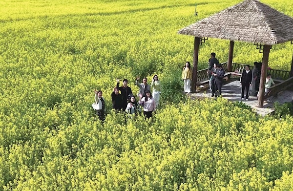 游客沉醉在五峰乡金黄色的油菜花海中。