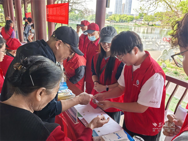 此外,红十字志愿服务队联合家庭医生团队开展心肺复苏、AED使用等急救技能培训,医护人员讲解春夏季传染病防控与科学膳食知识,消杀人员现场演示“翻盆倒罐”、规范用药等病媒防制实操技巧。长江大学地球科学学院大学生志愿者也主动参与,在紫阳湖沿岸及公园人流密集区,通过趣味互动普及生态环保、垃圾分类知识,引导居民树立“每个人是自己健康第一责任人”的理念。