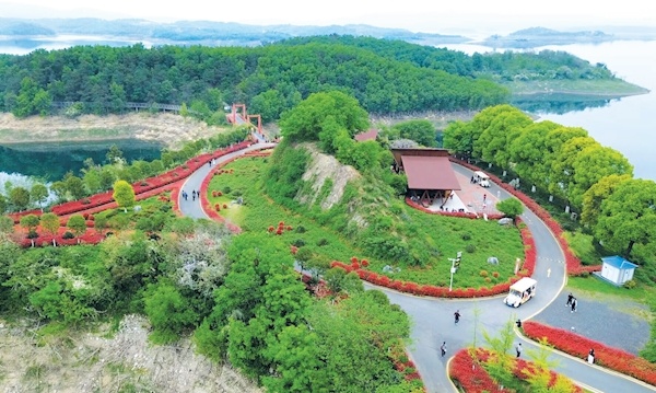 4月11日,游客在风景旖旎的丹江口市如意岛观光游览。该岛经多年精心打造,栽植杜鹃、红玉兰、凌霄、紫藤等各类花卉植物,后又陆续修建沧浪之光观光高塔、环岛栈道、观景平台等,成为丹江口环库绿道上的网红地标。记者潘世新摄