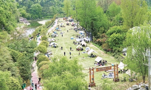 4月12日,茅箭区茅塔乡康家村露营小镇内,十余顶米色天幕整齐排布,二十余顶各色帐篷错落点缀,与远山近水、翠柳繁花相映成趣,勾勒出一幅生机盎然的春日画卷。