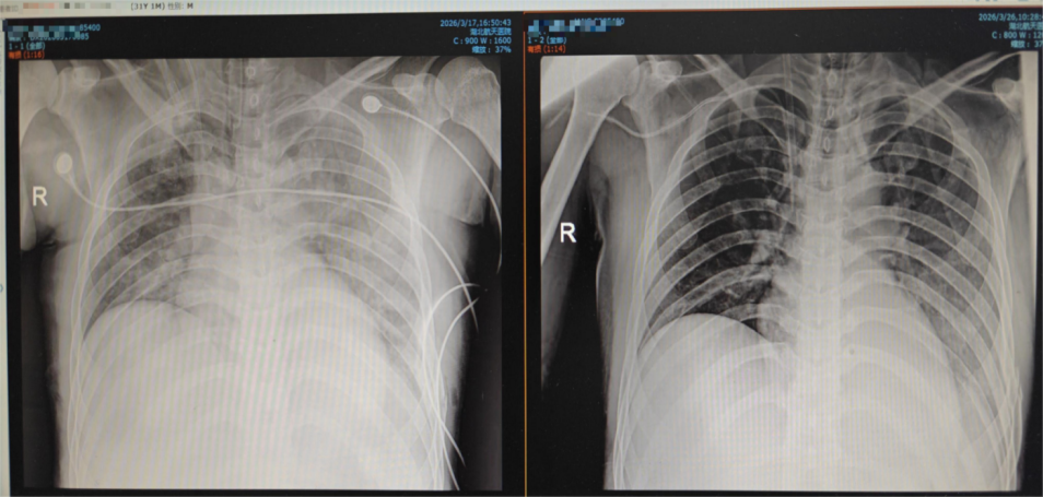 然而,病情在3月16日急转直下。患者出现呼吸急促症状,储氧面罩下血氧饱和度仅能维持在90%–92%,胸部CT检查显示双肺实变、双侧胸腔积血积液,被确诊为重度急性呼吸窘迫综合征(ARDS)。尽管医护团队立即采取气管插管、呼吸机辅助通气、肺保护通气、支气管镜灌洗等全套救治手段,患者病情仍持续恶化。