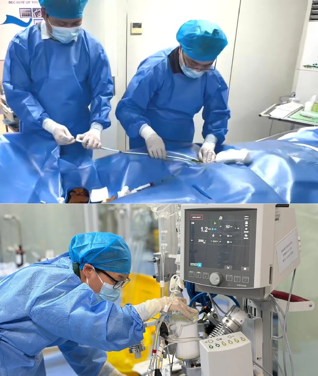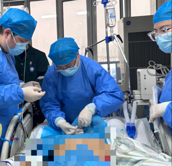 黄伟强和吴昊行ECMO穿刺置管、郑立莹行管路预冲