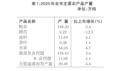 全年实现农林牧渔业增加值216.60亿元,按不变价格计算,比上年增长3.2%。粮食种植面积211.77千公顷,下降0.07%;棉花种植面积2.74千公顷,下降13.2%;油料种植面积49.97千公顷,增长3.2%。粮食总产量148.20万吨,增长0.4%;棉花总产量0.22万吨,下降12.5%;油料产量11.69万吨,增长4.1%。