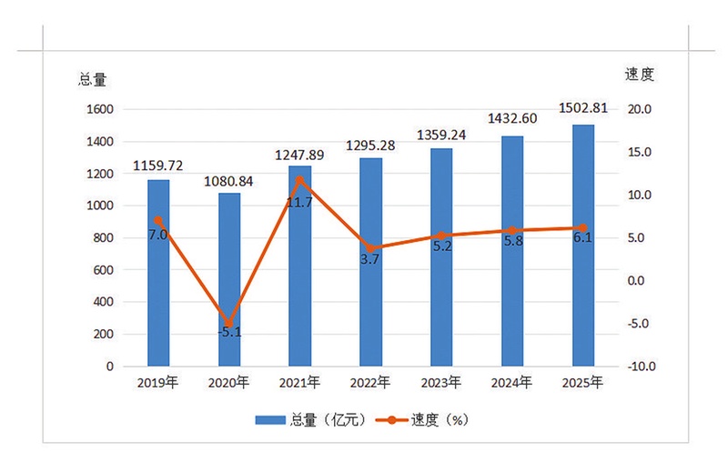 初步核算,2025年全市生产总值1502.81亿元,按不变价格计算,比上年增长6.1%。其中,第一产业增加值191.96亿元,增长2.7%;第二产业增加值578.16亿元,增长7.0%;第三产业增加值732.69亿元,增长6.4%。三次产业结构由2024年的14.2:38.4:47.4调整为12.8:38.4:48.8。全市人均地区生产总值为75287元。