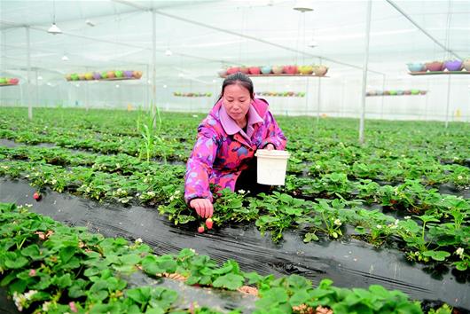 图为:大棚内,工人正在采摘草莓