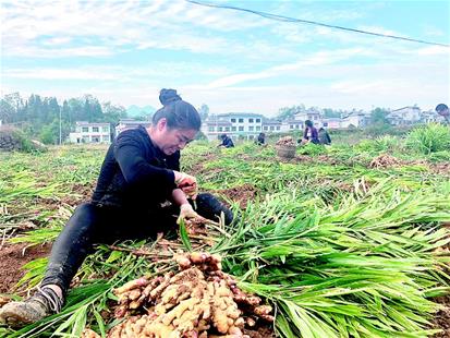 图为:2018年10月,周家湾村村民向菊芝在生姜种植大户地里务工,整理拔出的生姜。