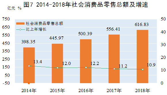 全年社会消费品零售总额616.83亿元,比上年增长10.9%。其中,批发零售业实现销售额547.4亿元,比上年增长10.7%;住宿餐饮业实现营业额69.43亿元,增长11.7%。按经营地统计,城镇消费品零售额459.72亿元;乡村消费品零售额157.11亿元。限额以上企业通过公共网络实现的商品销售同比增长44%。