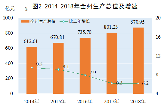 初步核算,全州完成地区生产总值870.95亿元,扣除价格因素,比上年增长6.2%。其中,第一产业增加值166.27亿元,增长2.7%;第二产业增加值296.17亿元,增长2.3%;第三产业增加值408.51亿元,增长10.9%。三次产业结构比为19.1:34.0:46.9。按年均常住人口计算,全州人均生产总值达到25848元,增长5.7%。全州全员劳动生产率为41503元/人。