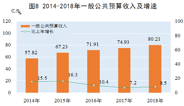 全年地方财政总收入171.13亿元,比上年增长6.9%。其中,地方一般公共预算收入80.21亿元,增长8.5%。在地方一般公共预算收入中,税收收入60.96亿元,增长13.5%。全年一般公共预算支出391.76亿元,增长15.1%。其中,一般公共服务支出37.94亿元,增长6.3%;社会保障和就业支出51.67亿元,增长7.4%;科学技术支出3.6亿元,增长11.1%;教育支出71.78亿元,增长8.2%;医疗卫生与计划生育支出40.99亿元,增长3.8%。民生支出334.2亿元,增长16%,占一般公共预算支出的82.1%。