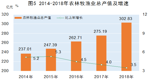 全年农林牧渔业实现总产值302.83亿元,增长3.5%。全年农用化肥施用量(折纯)25.85万吨,农用塑料薄膜使用量0.28万吨,农用柴油使用量0.58万吨,农药使用量0.13万吨。