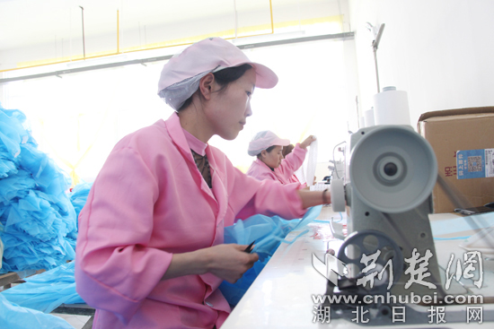 张敏忠在恩施诚建防护用品公司上班挣钱 通讯员唐旻摄