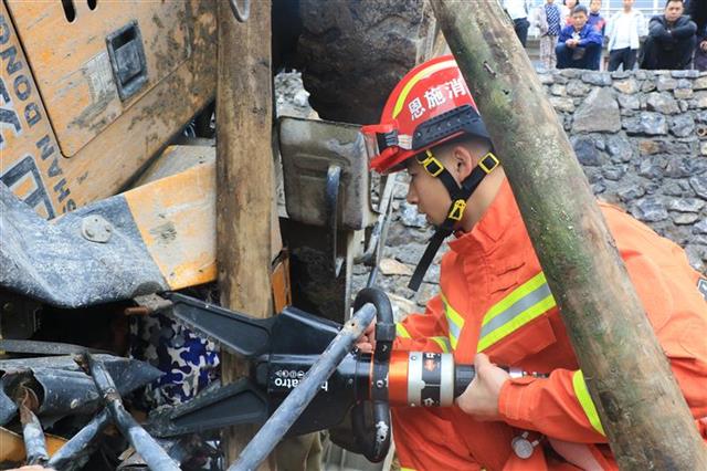 21日早上8时40分,恩施市屯堡乡鸦丘坪村一铲车发生侧翻司机被困,恩施消防破拆救援,成功将被困人员救出。