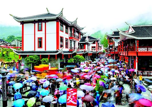 图为:2018年度恩施土家女儿会在龙马风情街举行,虽然下着蒙蒙细雨,仍吸引1万余名游客兴致勃勃冒雨游玩。(资料图片由视界网伍功勋摄)