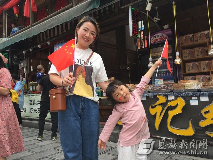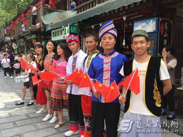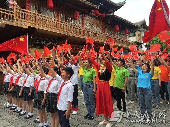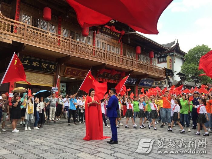 4月27日上午11时,一曲《龙船调》唢呐声响彻恩施土家女儿城。信步于城内的游客被它所吸引,开始追寻它的来源,却不知已参与进了一场精心策划的红歌快闪活动。当唢呐声、阿卡贝拉、街舞、军鼓声碰撞在一起时,来自天南海北的同胞一同挥舞五星红旗,自觉合唱《我和我的祖国》。
