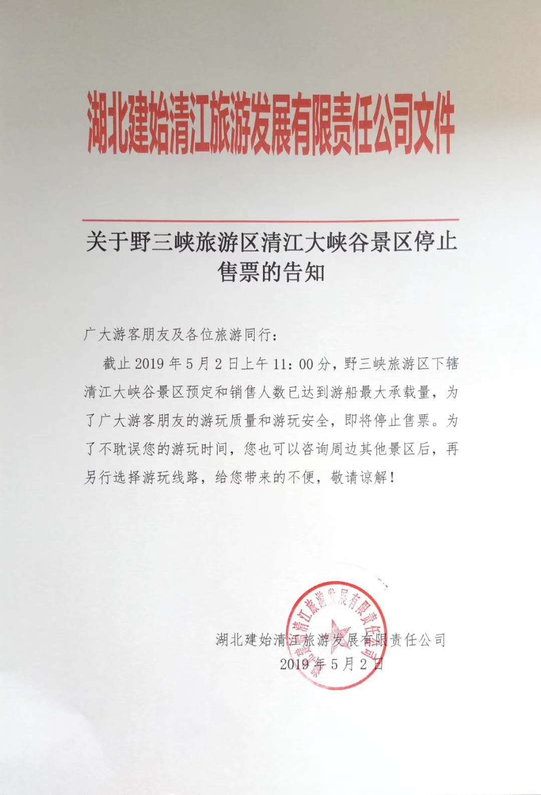 长江日报融媒体5月2日讯(记者贾蓓)5月2日上午11时,由于景区预订和销售人数已经达到最大承载量,恩施野三峡清江大峡谷景区宣布停止售票。