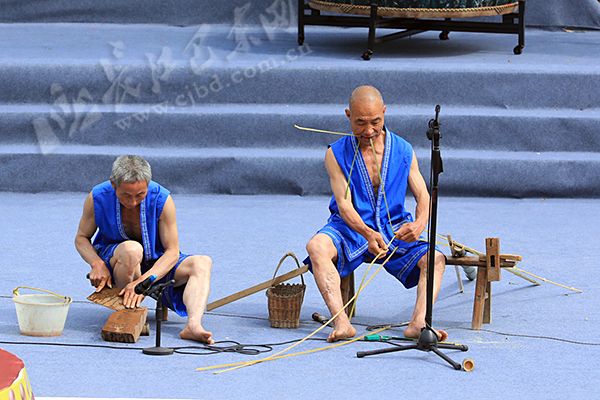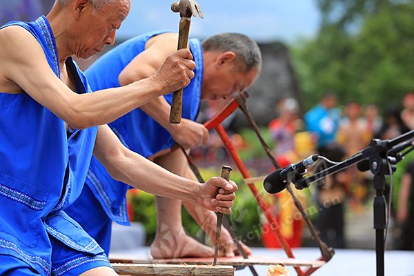 “叮、叮、叮……”伴随着劳作声,只见一群年近七旬的老汉们,身穿土家蓝布对襟衣,气定神闲地在舞台上表演传统技艺,显得一派从容。