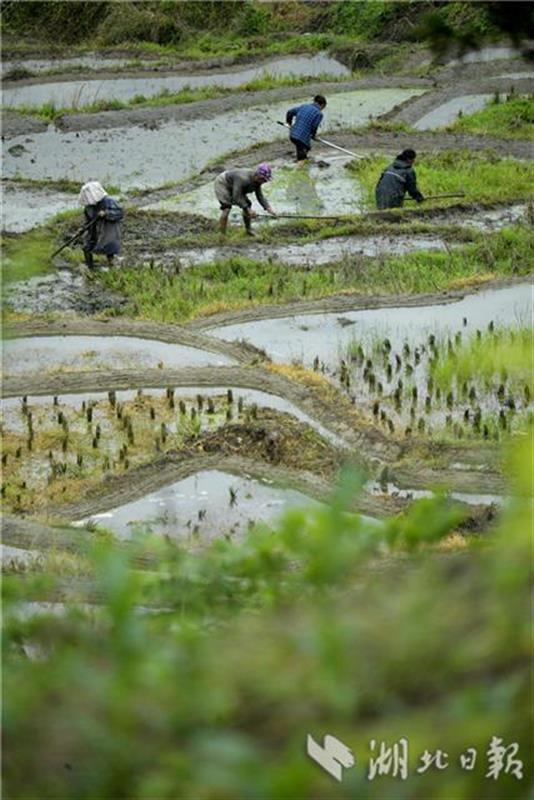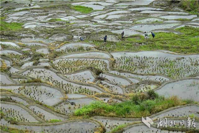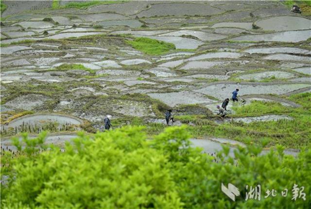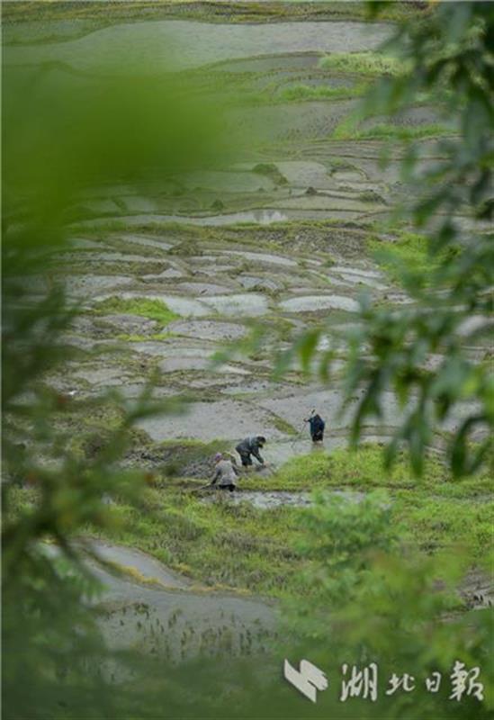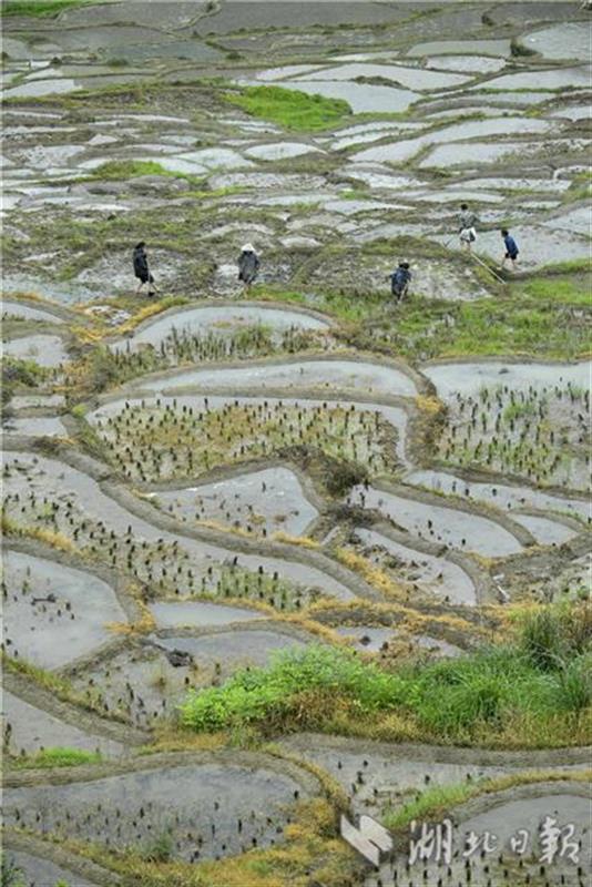 5月13日,宣恩县沙道沟镇木笼寨村的农民在梯田里劳作。初夏时节,宣恩县沙道沟镇木龙寨村农民开始耕耘沿山坡分布的数以千计的梯田,这些梯田因每丘块面积太小,无法使用耕牛耕作,更无法使用机械,农民们只能用借助锄头、钉耙等简单工具进行翻地、平整后插秧,从而也保存了最原始、最传统的耕作方式。如今,木龙寨层层叠叠的“微稻田”每年的夏种、秋收都会吸引大量游客。人们到此不仅能欣赏由“微稻田”组成的梯田风景,感受传统的土家农耕文化,同时,还能品味一堂农民在小到仅三五平方米的稻田里辛苦耕作、用实际行动给游客特别是青少年上的一堂珍爱土地、爱惜粮食的实践课。(视界宋文摄)