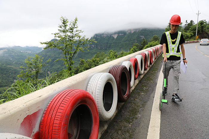 6月5日,工作人员正在对S233省道上新装的防撞软墙进行验收。