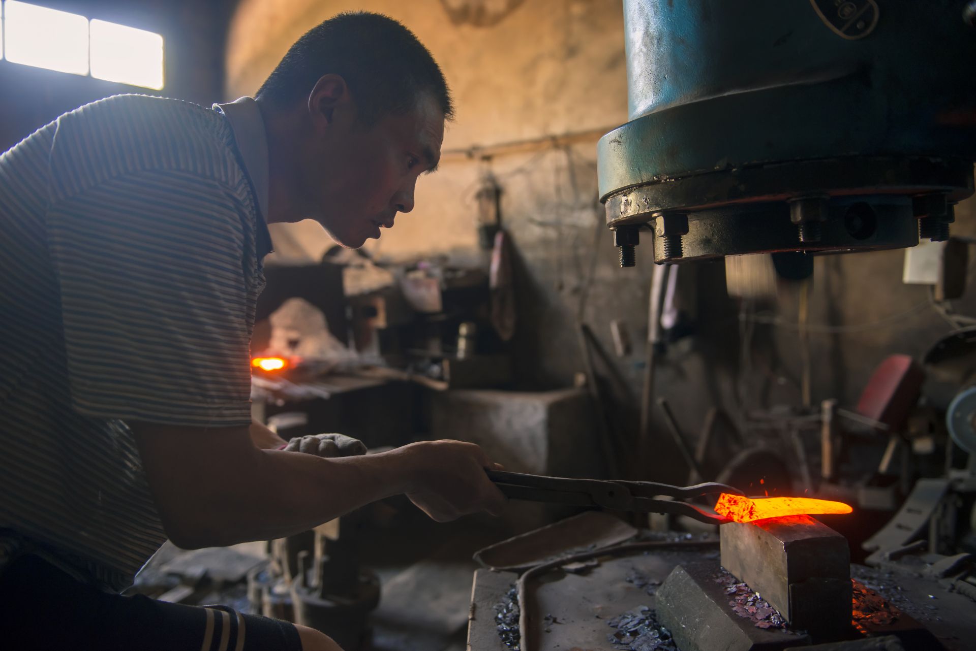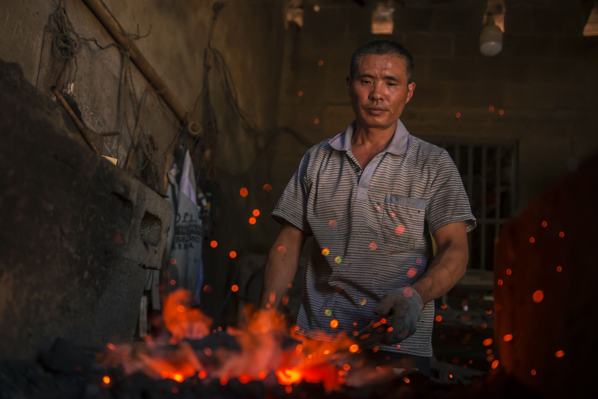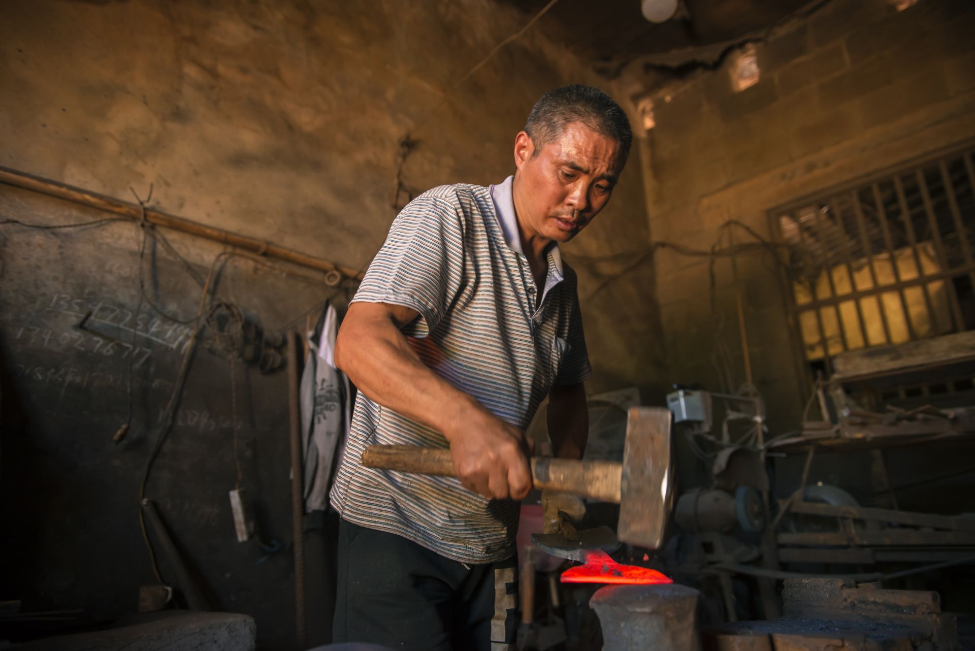 无论春夏秋冬,李正兵每天坚持打铁十几个小时。夏天太热,凌晨3点起床,干到上午10点多回家休息,下午4点钟接着干,直到晚上8点左右才回家。 到铁匠铺帮锤的赵燕龙师傅介绍:“打铁过程中,屋内温度很高,每个人都大汗淋漓,但丝毫不会影响我们打铁时的专注。打铁飞溅出来的铁花,衣服烧得大洞小洞,手指烫缩了……打铁大锤和小锤的配合至关重要,如果两个锤子产生碰撞,在力的作用下,小锤很容易把人砸伤。随着时代的变迁,过去的大锤有了空气机替代”。 李正兵说,打铁看似简单,实则不易。要打造出好的铁器,经验很重要,材料的可锻性,打铁的火候、起锻,打铁位置都有讲究。然而在经验丰富的老铁匠手中,坚硬的铁块也能如变戏法般地变得方、圆、长、扁、尖。 “打铁先要本事硬。”没有力气不能打铁,沉重的大锤轮番起落,需要的是气力和耐力。