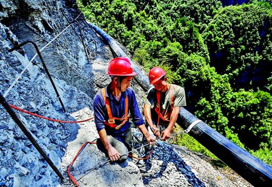 2日下午4时许,绝壁上最后一根水管焊接完成固定在山上。“完工啰!太好了,可以通水了。”大家伙兴奋地呐喊,山谷间回荡着土家汉子雄浑的号子。