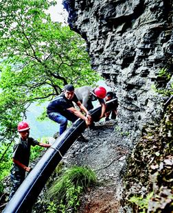 一开始,工人们用绳子将水管套住,从悬崖顶端往下面放。悬崖坡度很陡,有些地方无法使用焊接设备,实在没有着力点的地方,只好先将一根根水管在相对较平稳的地方用热熔技术焊接好,再抬起来向悬崖一端慢慢移动。崖上有些地方树木太小不能承受重力,只能在岩石上打铆钉,再用钢丝绳将水管套牢,固定在悬崖上。