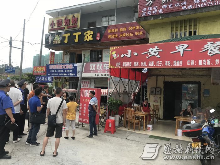 当天上午,恩施晚报记者随工作人员从桂花园社区居委会出发,沿金子坝路前行,发现湖北民族大学南门对面的一栋居民楼,悬挂了7张广告牌,沿街的外墙已被五颜六色的广告牌覆盖,非常凌乱,很不美观。该居民楼旁是一家早餐店,一个可伸缩的钢架棚从早餐店门前延伸至路边,棚里摆着4套座椅,里面坐满了吃早餐的人。
