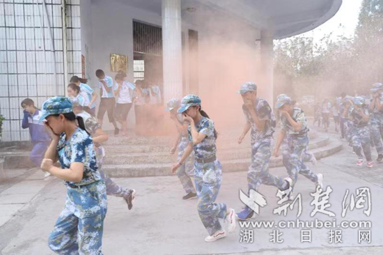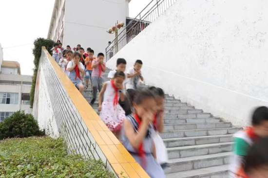 9月5日,巴东县消防救援大队走进该县实验小学,开展消防演练, 演练假设学校教学楼发生火灾,警报响起后,同学们在老师的组织下,捂住口鼻,弯着腰,快速地从疏散楼道撤离到安全区域,整个过程紧张有序。