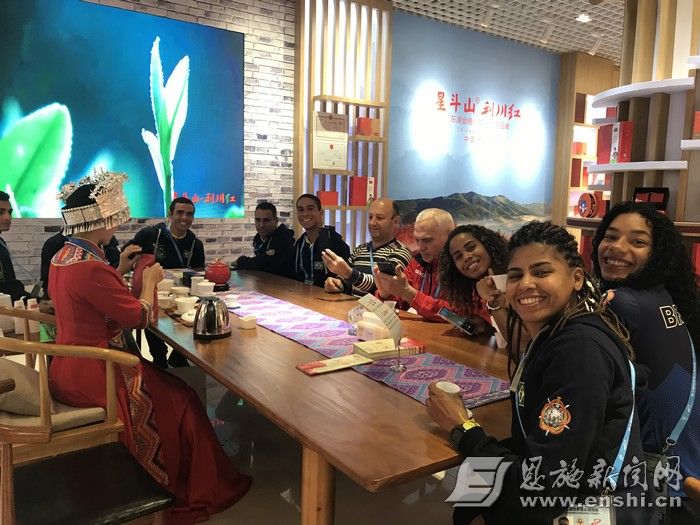 10月16日,参加第七届世界军运会的外国运动员在武汉军运村“利川红”展馆品鉴冷后浑。连日来,慕名到此品饮、购买“利川红”的各国运动员络绎不绝。