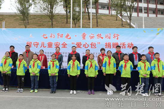 白杨坪中心小学位于恩施城区30余公里外,和很多山区学校一样,该校学生有一半以上是留守儿童。15日下午,初冬的微风中,孩子们在老师的带领下兴冲冲地排好队伍,一场简短的捐赠仪式开始。这是由恩施州助学扶贫促进会、中国农工民主党恩施州委员会、恩施州妇女联合会、恩施州工商业联合会(总商会)共同发起的“七彩阳光·童安校园行”公益慈善捐赠活动,当日由湖北和诺生物工程股份有限公司向孩子们捐赠智能安全书包和安全丛书。
