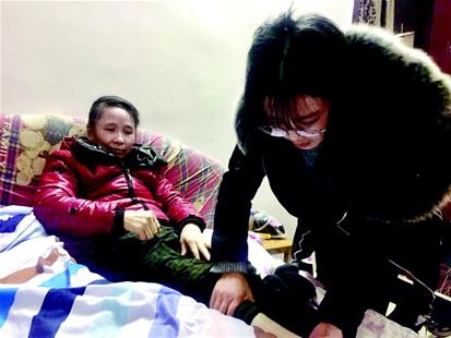 每天早上杨玉霞去上课后,黄菊贵就坐上轮椅自己做早饭,菜是杨玉霞提前买好的,一次管两三天。做饭时,黄菊贵用双手将身体挪到床边,再慢慢移动到轮椅上。中午,杨玉霞一下课就赶回家做午饭,晚上下了自习再回家做晚饭。吃过晚饭,她会帮妈妈按摩腿部,一边按摩一边陪妈妈聊天。