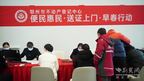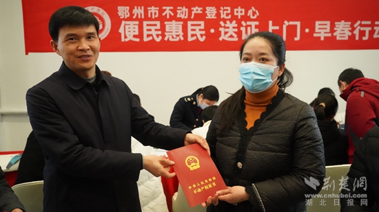 荆楚网(湖北日报网)讯(通讯员 周婷)3月22日上午,鄂州市不动产登记中心开展“便民惠民送证上门”活动,将办证服务窗口延伸到楚天都市鑫园售楼部,现场接受购房群众申请,现场受理,现场发证。