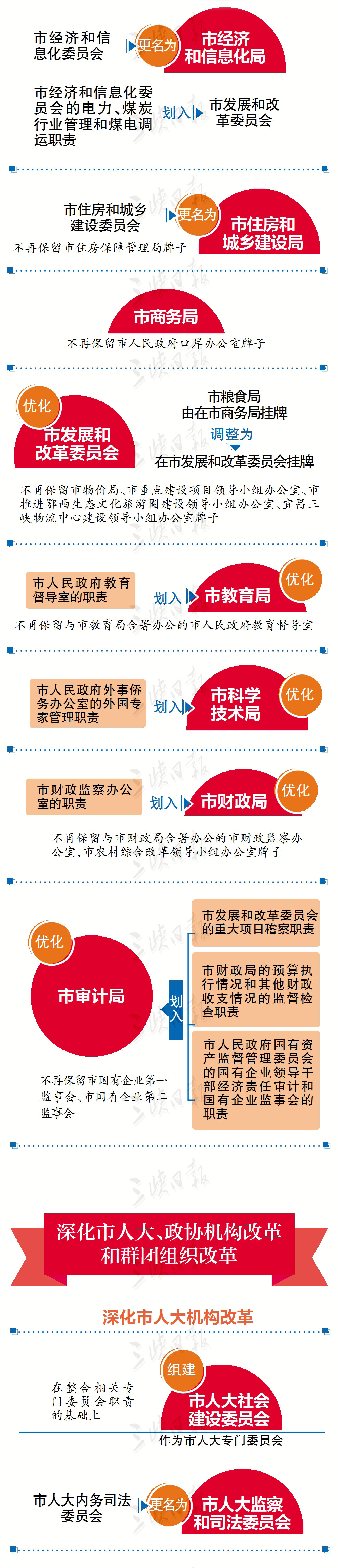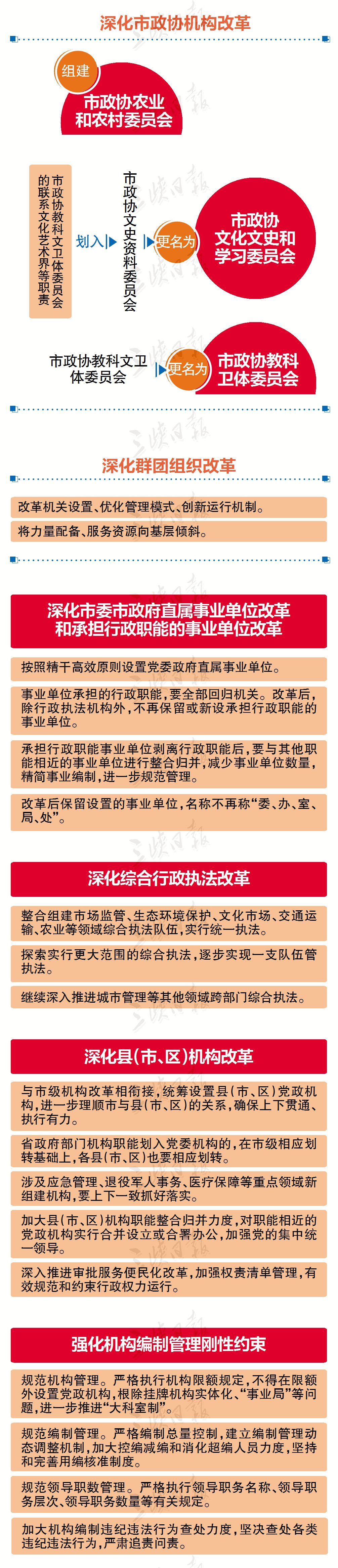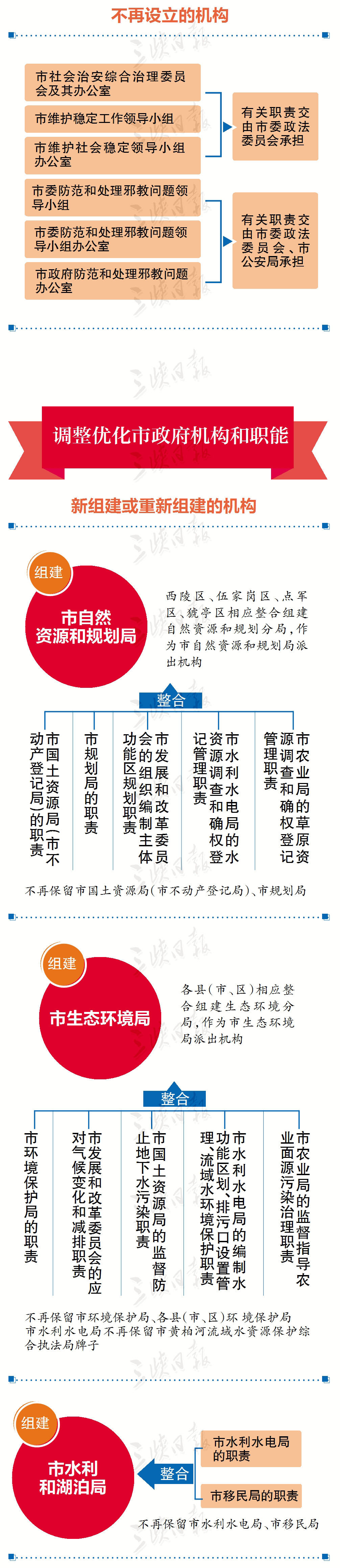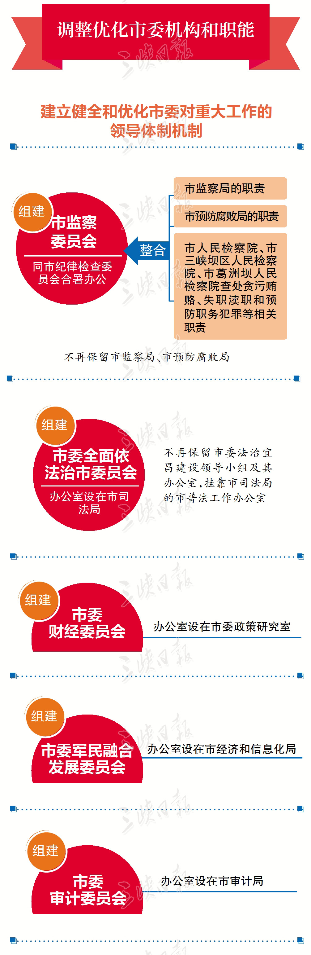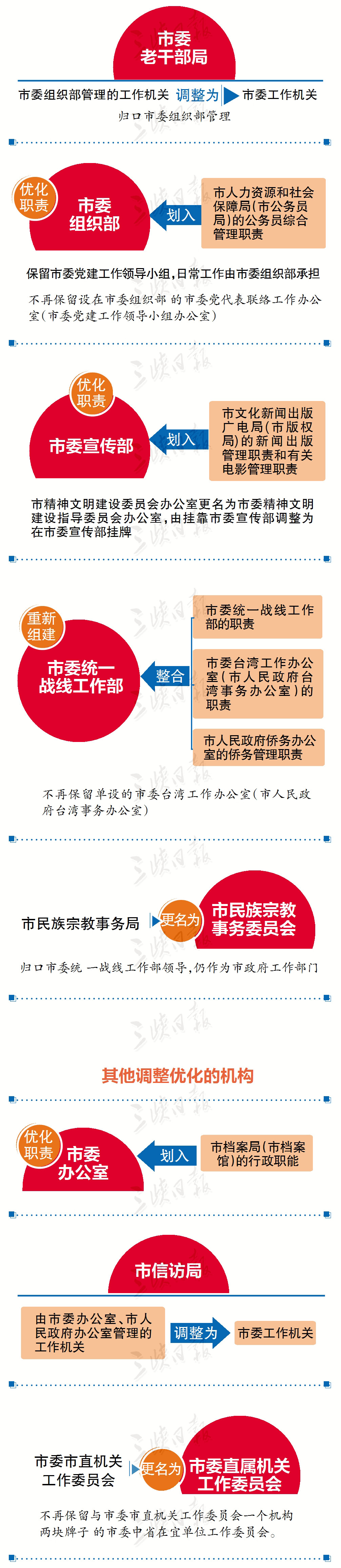 优化党的组织机构,深化监察体制改革,加强市委办公室、市委组织部、市委宣传部、市委统战部等部门的统一归口协调管理职能。