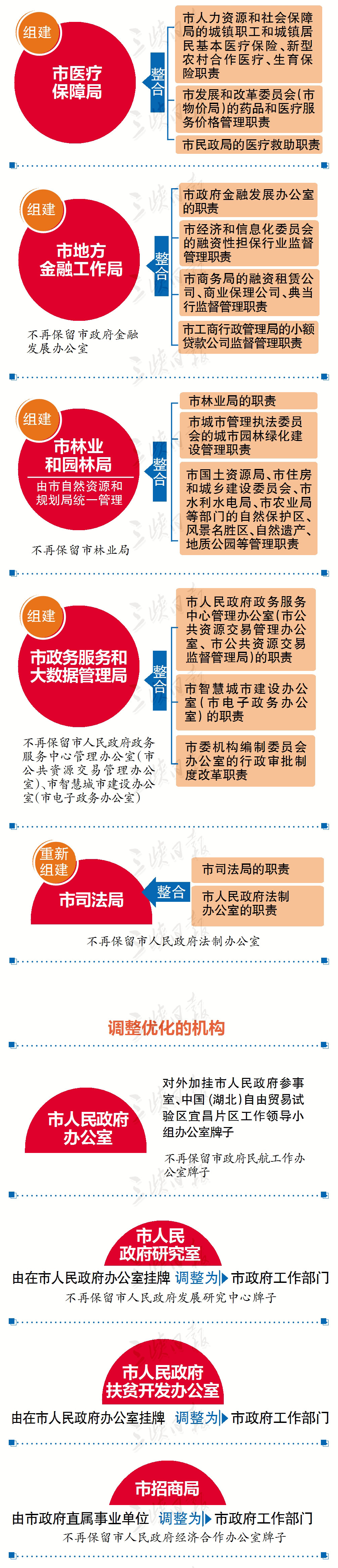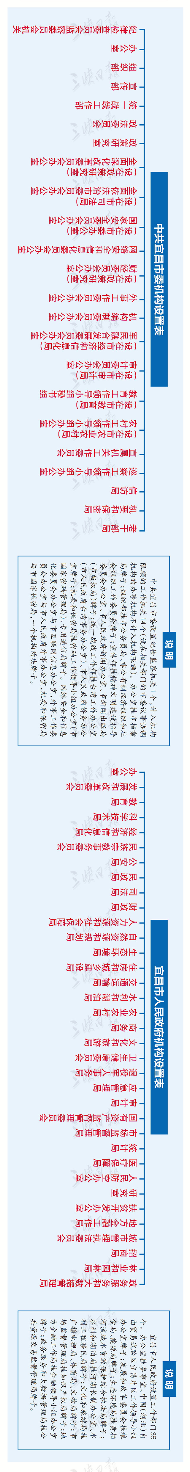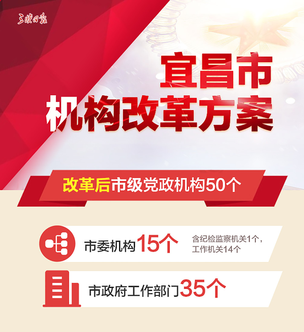 改革后,宜昌市本级共设置市级党政机构50个。其中市委机构15个(含纪检监察机关1个,工作机关14个)。市政府工作部门35个。在逐项落实中央、省委机构改革“规定动作”,做到主要机构设置与中央、省保持基本一致,确保上下贯通、执行有力的同时,根据宜昌实际,在机构限额内因地制宜设置了地方金融工作局、招商局、林业和园林局、政务服务和大数据管理局等机构。