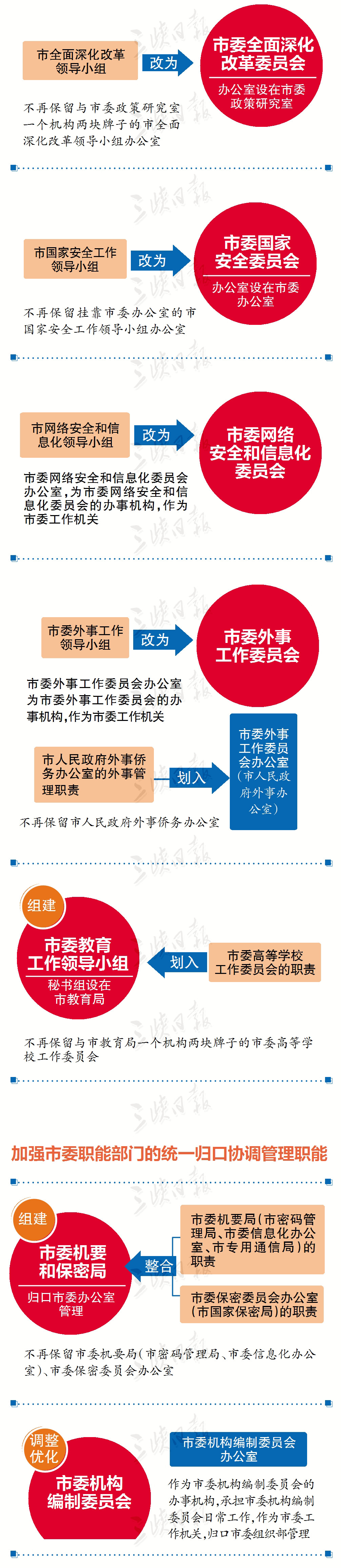 加强党对重大工作的集中统一领导,新组建全面依法治市、财经、军民融合发展、审计、教育等市委议事协调机构,将全面深化改革、国家安全、网络安全和信息化、外事等领域领导小组改为委员会,进一步加强市委的统筹领导。