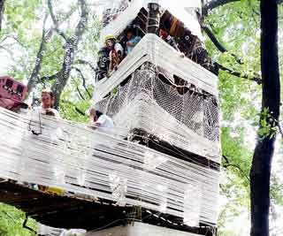 树干为柱,绳子为墙,树荫成顶,这座造型别具一格的“树屋”(如图),昨日在华中科技大学正式落成。100多个孩子和父母成为它的第一批访客,其中不少人还是它的建造者。(楚天都市报)