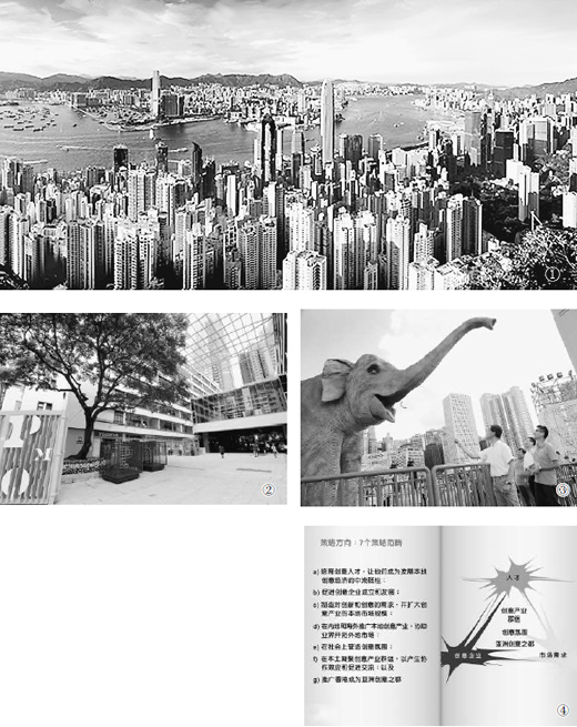 图①:香港一景。图②:元创方外景。图③:荔园的标志性大象“天奴”形象重现。图④:“创意香港”办公室宣传资料。资料图片