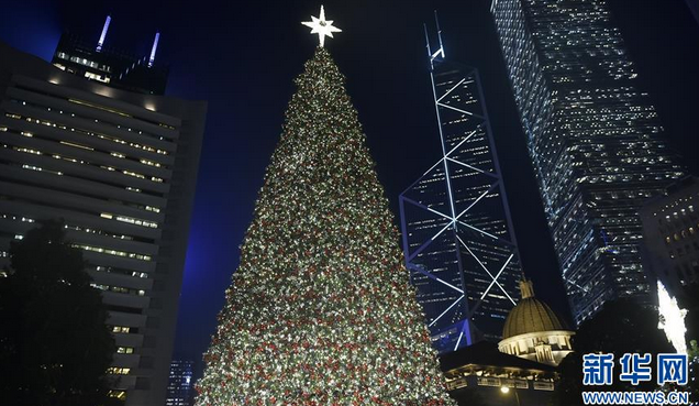 12月2日,巨型圣诞树在香港中环皇后像广场被点亮。当日,作为“香港缤纷冬日节”项目之一的15米高圣诞树在香港中环皇后像广场举行亮灯仪式。 新华社发(王申 摄)