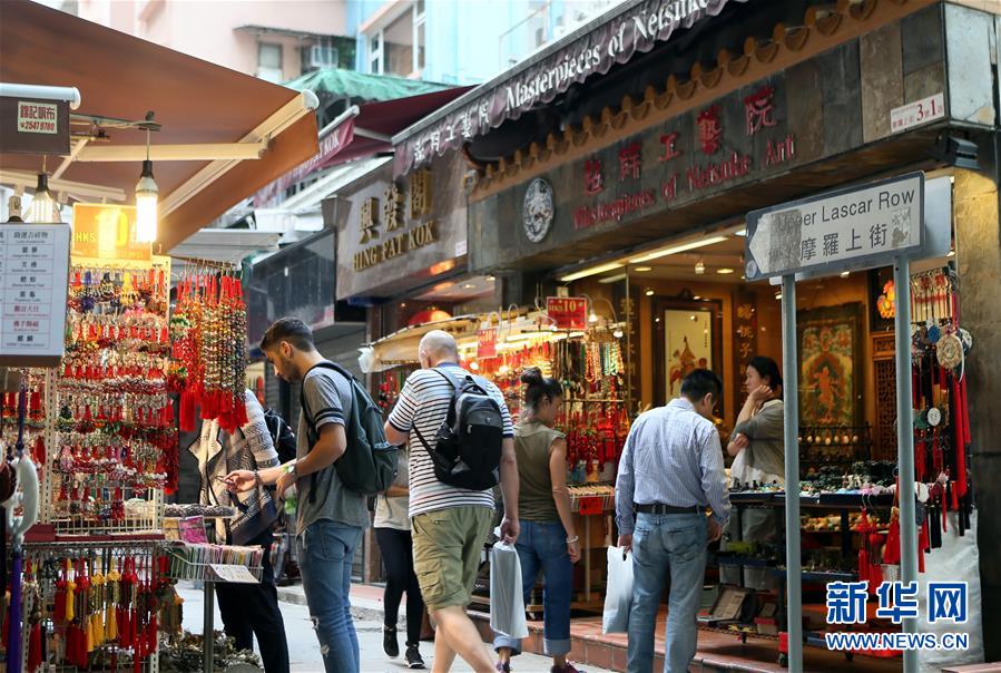4月28日,游客在香港摩罗上街选购纪念品。香港旅游发展局自4月26日开始面向市民及游客推出全新旅游推广项目“旧城中环”。该项目重新整合了中环和上环的多元旅游特色,推出5条主题漫步游路线,分别代表区内历史建筑及地标、艺术文化、美食、时尚生活等不同元素。