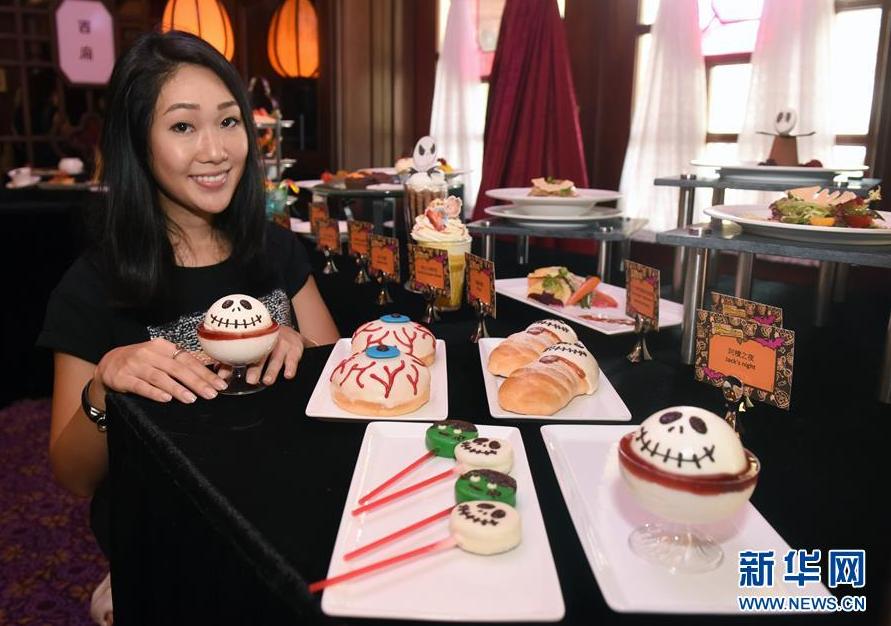 9月13日,在香港迪士尼乐园,一名模特展示“万圣节”主题食品。