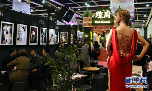 3月11日,一家参展公司的发型师在香港婚博会上做新娘发型示范。为期三天的香港婚纱暨海外婚礼博览、香港婚宴暨婚礼布置博览3月10日至12日在香港会展中心举行。来自各个国家和地区的300多家参展商参展,为新人们提供一站式服务。