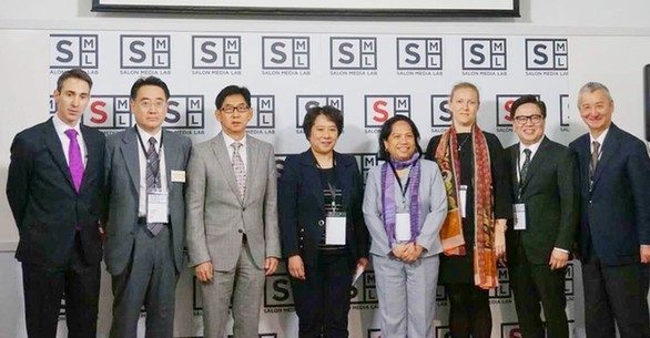香港沙龙电影董事长汪长禹(左四)、香港生产力促进局前总裁鄧觀瑤(左三)、中央电视台中国广播电影电视节目交易中心总裁马润生(右三)与IUIA团队合影