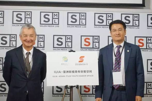 香港沙龙电影董事长汪长禹(左)与IUIA秘书长孙万松(右)共同为“IUIA-亚洲影视青年创客空间”揭幕