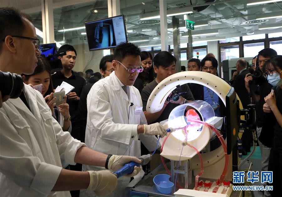 4月19日,人们在新启用的香港理工大学三维打印技术中心实验室参观。当日,香港理工大学三维打印(3D打印)技术中心实验室开幕,该校与一所公立医院合作利用三维打印技术研发的导管主动脉瓣植入术模拟系统也同时启用。