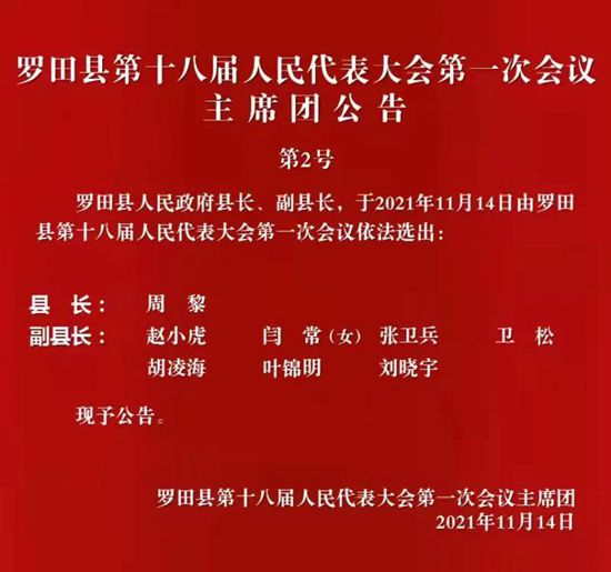 荆楚网(湖北日报网)讯(通讯员颜红胜、陈钦)罗田县第十八届人民代表大会第一次会议,选举产生新一届县政府领导班子,周黎当选罗田县人民政府县长,赵小虎、闫常、张卫兵、卫松、胡凌海、叶锦明、刘晓宇当选为罗田县人民政府副县长。