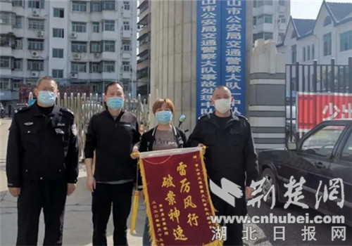 荆楚网客户端—荆楚网消息(通讯员 徐娟)4月14日下午,一对中年男女将一面镶着“雷厉风行,破案神速”的锦旗交到京山市公安局交警大队事故处理中队队长盛常斌和民警张伟手中,他们是“3.23”交通肇事逃逸案的受害人家属,对办案单位历时六天六夜攻克案件,为不幸逝世的亲人主张正义,并促使肇事方积极履行民事赔偿责任表达了衷心感谢。