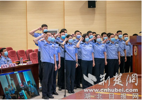 京山市公安局党委委员、政工室主任廖承枫带领19名新警进行了庄严的入警宣誓,局班子成员分别为从警满10年、20年、30年的18名民警代表颁发了荣誉纪念章。活动现场,还播放了电视专题片《热血忠诚·无悔担当》,集中展现了全市公安民警用青春热血洒满征途,几十年如一日激情书写人民警察忠诚履职的华彩篇章。