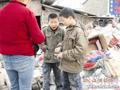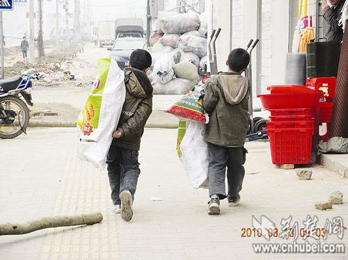 荆楚网消息 (楚天都市报) (记者张欣 李响)两名小学生,背着几乎和他们个头齐高的蛇皮袋,沿路拾荒。这一场景被拍客范先生无意中看到。让他大跌眼镜的是,两个孩子卖了废品,却拿着辛苦赚得的7元钱直奔黑网吧。近日,这一组实景记录的照片出现在网络上,立即引起了众多网民的热议。
